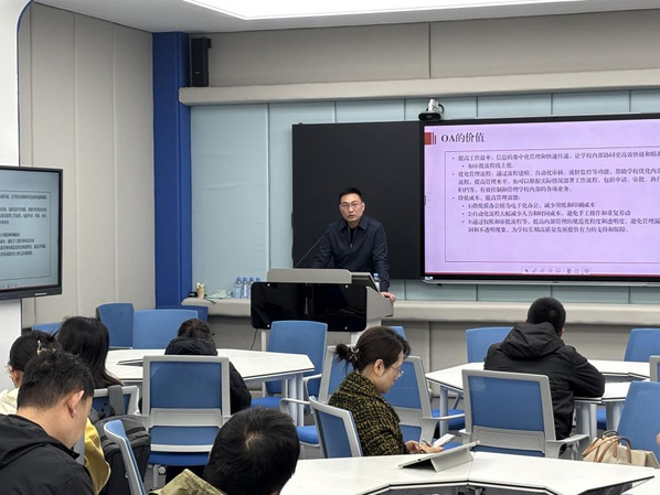 “办公自动化系统应用及规范公文处理培训”,由党政办公室秘书科科长周宇颂主讲。他紧扣日常办公的核心需求,系统讲解了学校办公自动化系统的功能模块与操作规范、公文处理的标准流程与写作要求,实操性突出,帮助参训教师熟练掌握日常办公核心工具,切实提升行政办公的规范化水平与工作效率。